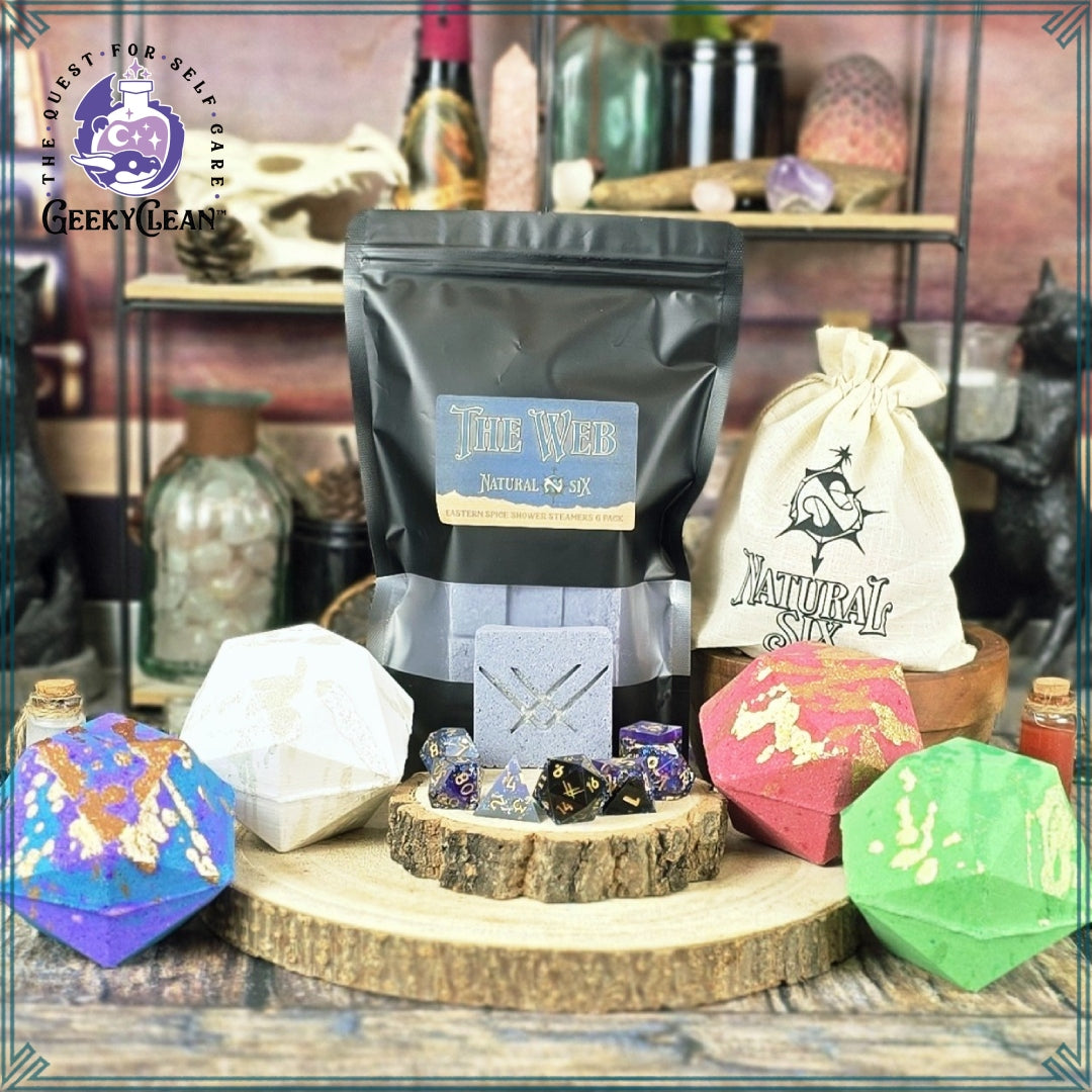We’ve teamed up with our friends at Geeky Clean to bring you themed bath bombs, shower steamers, and an exclusive Dice Bomb containing a brand-new and limited-edition Natural Six dice set!